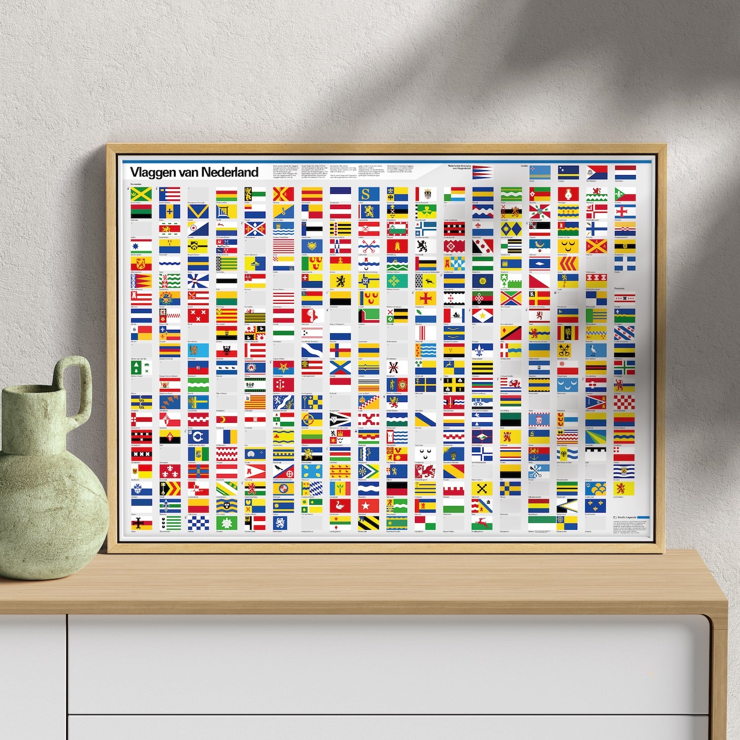 De poster bevat de vlaggen van gemeenten, provincies en landen binnen het koninkrijk der Nederlanden. Niet alle gemeenten hebben een officiële vlag echter. Vlaggen die niet zijn opgenomen in het vlaggenregister van de Hoge Raad van Adel (HRvA) zijn weergegeven als grijs vlak met daarin een asterisk (*). Veelal zijn dit logovlaggen. Een logo(vlag) representeert alleen de gemeentelijke organisatie en niet de inwoners van de gemeente. Bij enkele gemeenten ontbreekt een vlag volledig. Deze hebben een grijs vlak met kruis (×). Op BlueSky heb ik een paar bijzondere vlaggen uitgelicht!